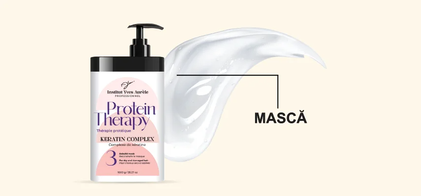 MASCĂ PROTEIN THERAPY (1000 g): Mod de utilizare: aplicați produsul pe părul spălat și umed. Pentru un efect mai bun, înfășurați părul într-un prosop și încălziți-l cu un uscător de păr. Lăsați să acționeze 5-10 minute, apoi clătiți bine cu apă.